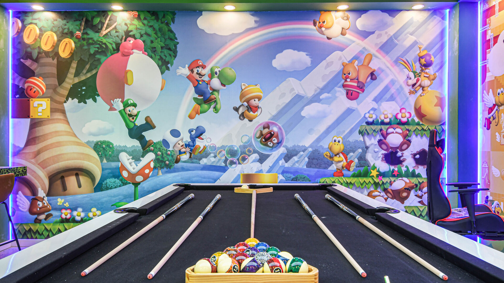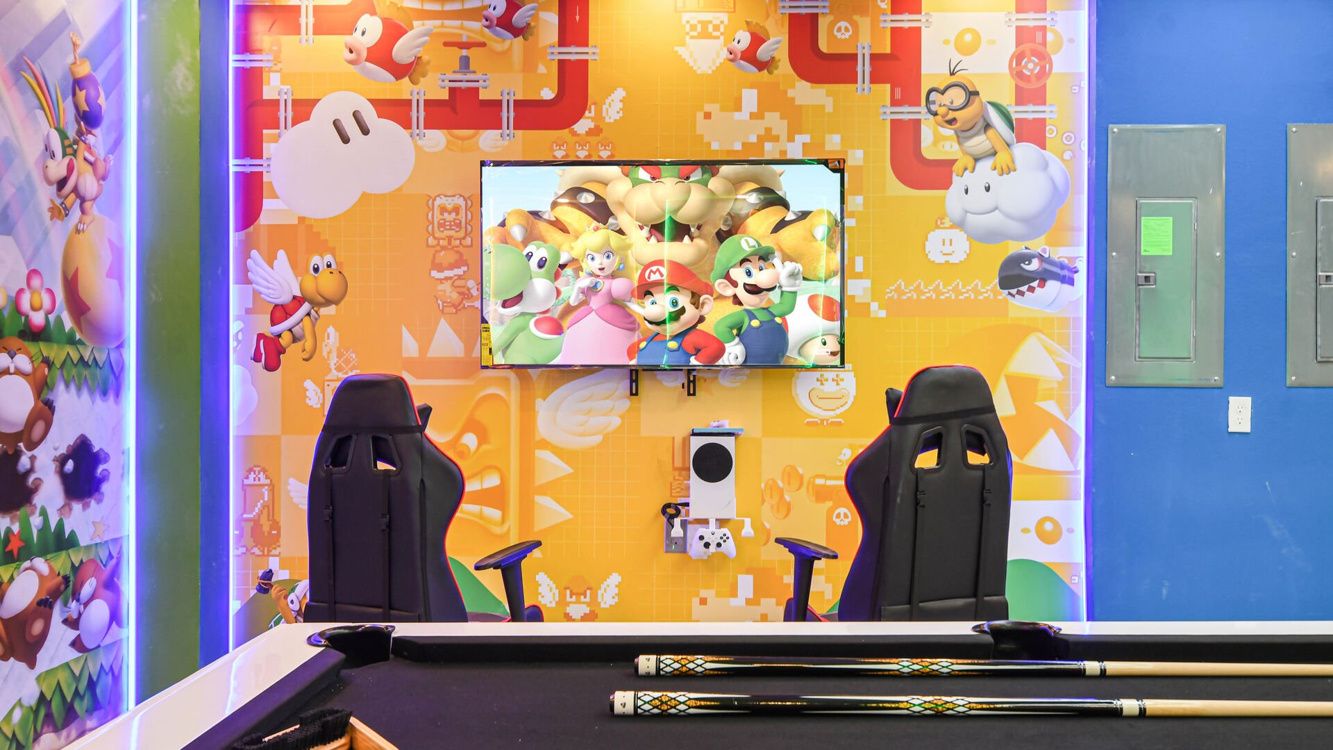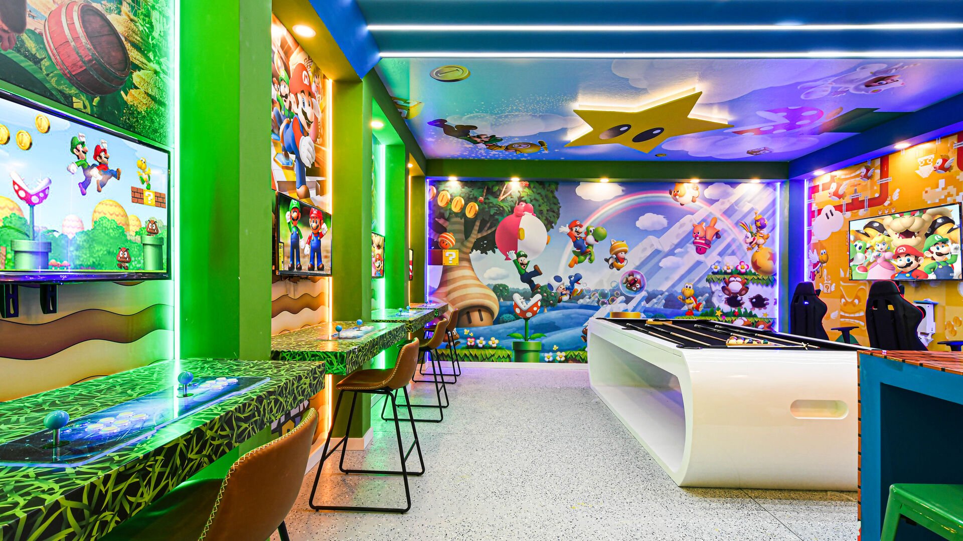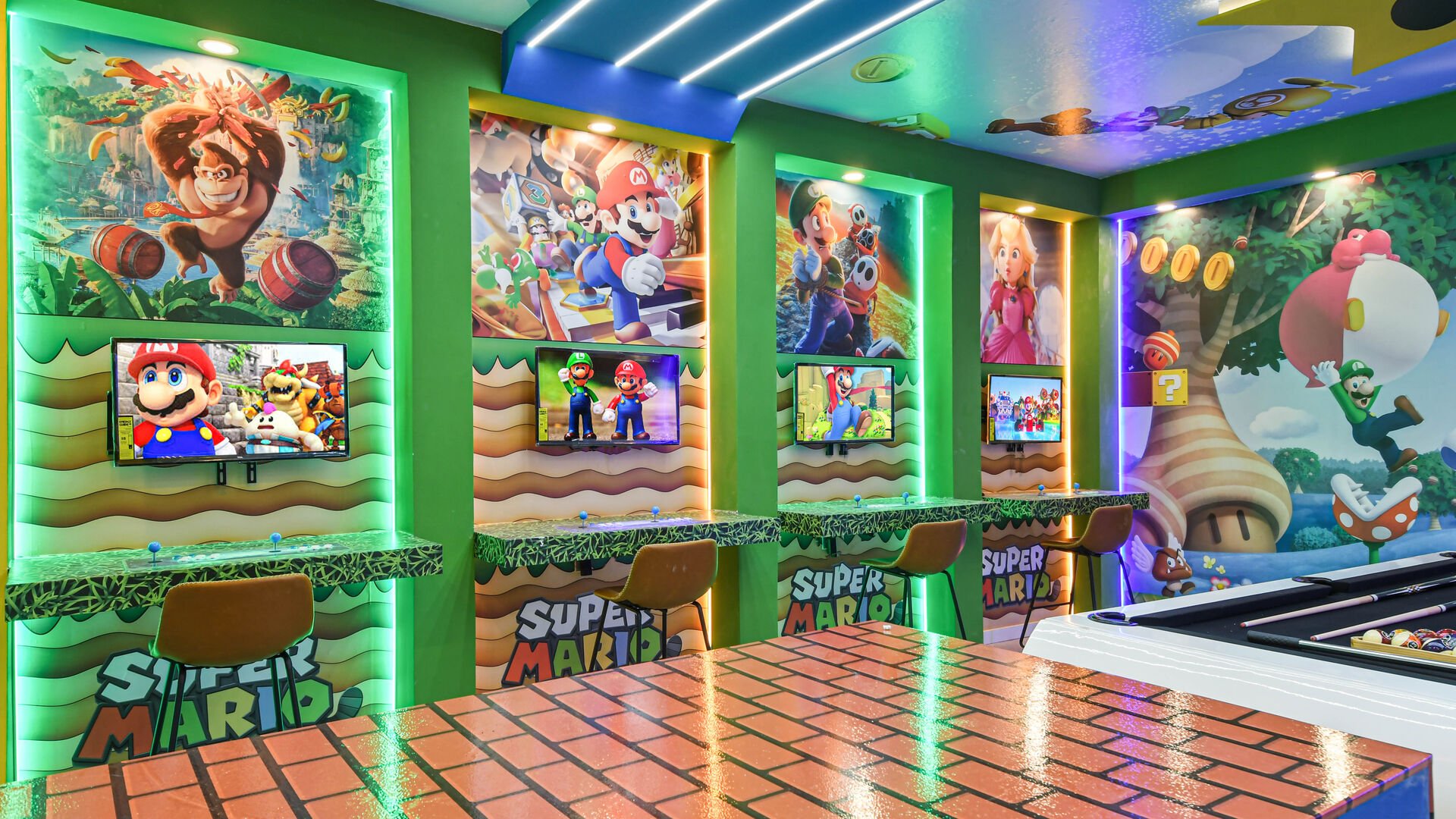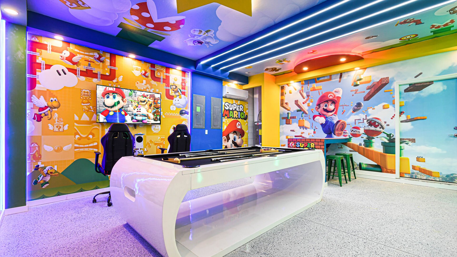 Mario Themed Game Room: Featuring computer games and a pool table.