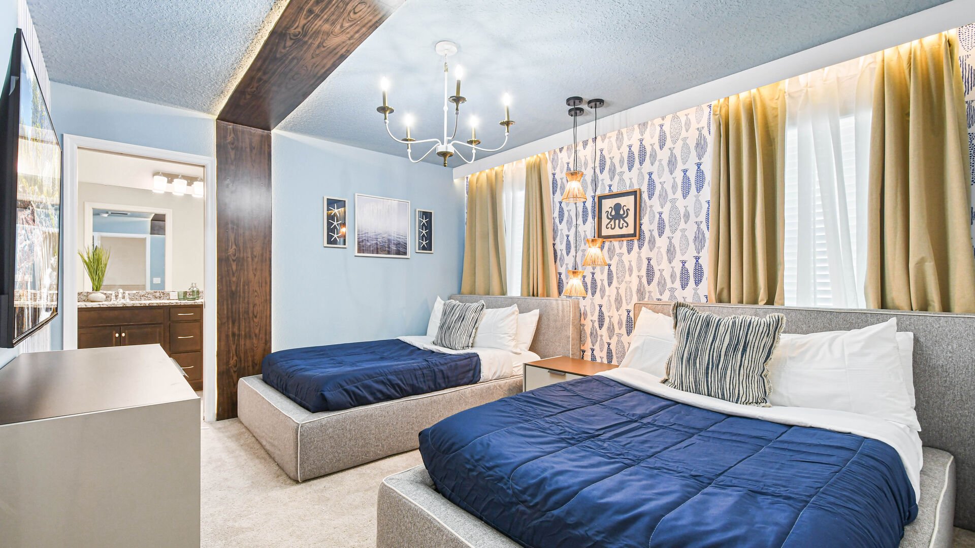 - Bedroom 1: King bed with a crib