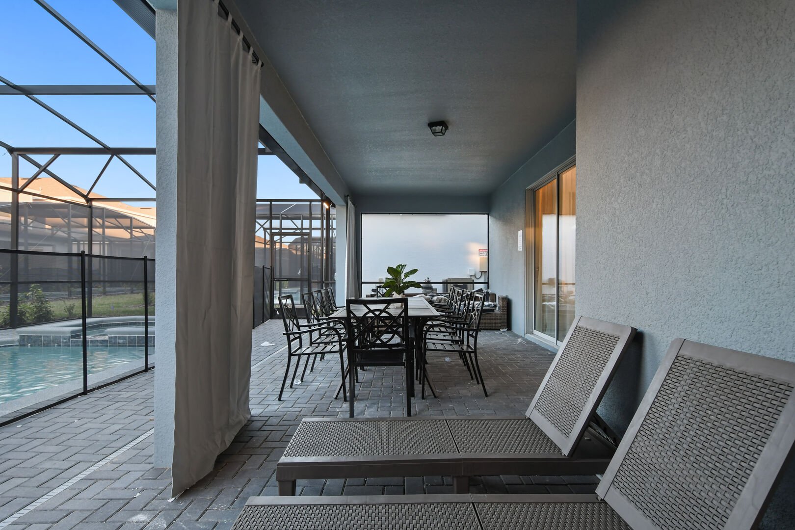 Private Pool & Jacuzzi: Enjoy your heated oasis, complete with loungers, a patio set, and a safety fence for children.
